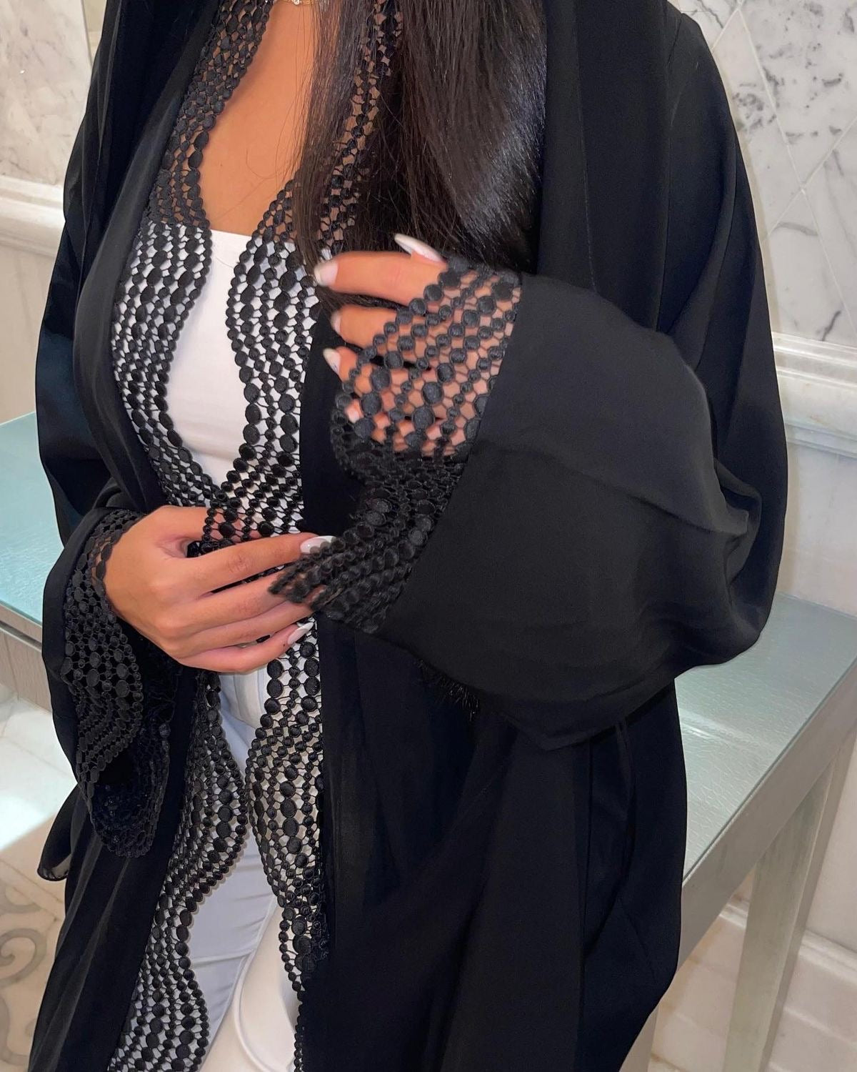 Indulge in elevated sophistication with our malika black lace abaya collection. A flawless fusion of timeless style and exquisite lace, this collection effortlessly elevates your appearance for any event.